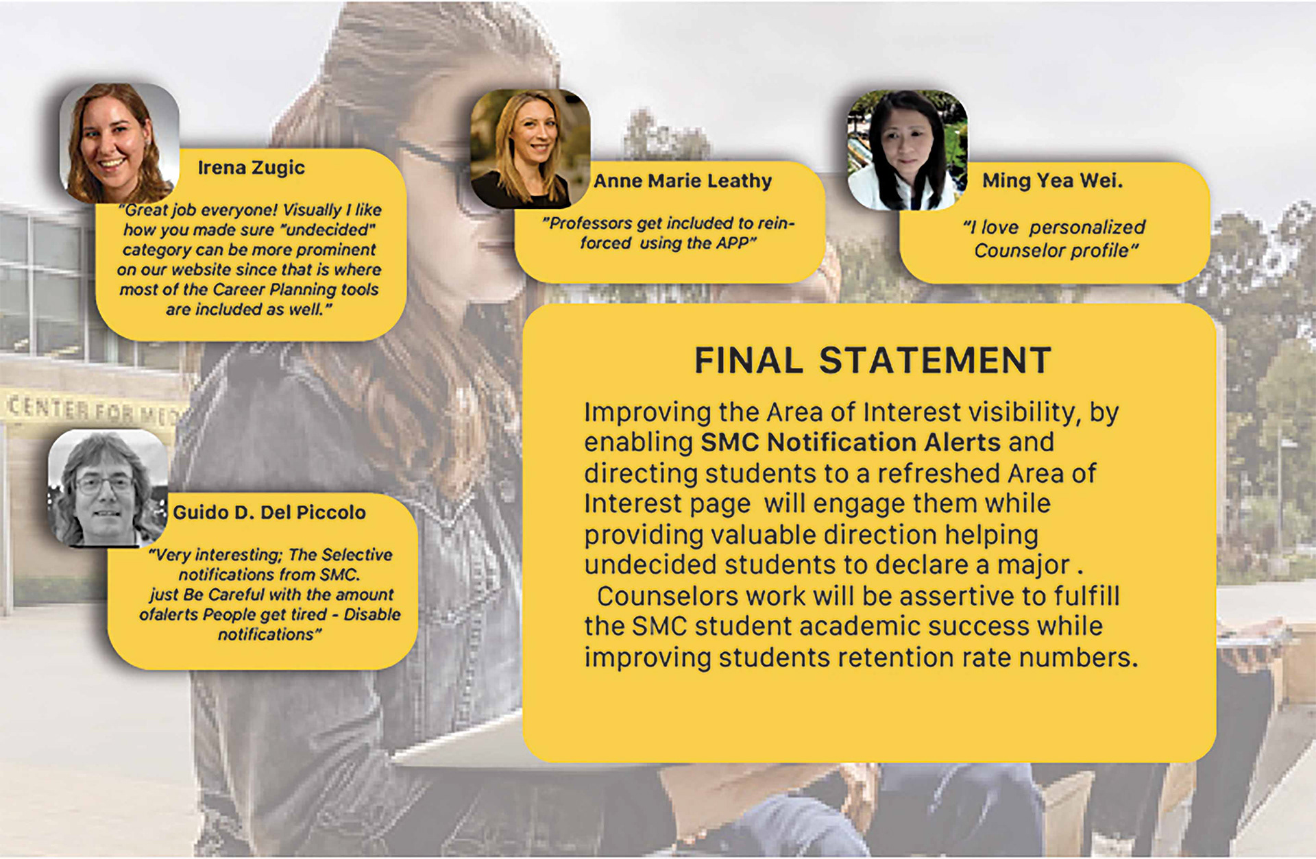 Improving the Area of Interest visibility, by enabling Santa Monica College Notification Alerts and directing students to a refreshed Area of Interest page will engage them while providing valuable direction helping undecided students to declare a major.
